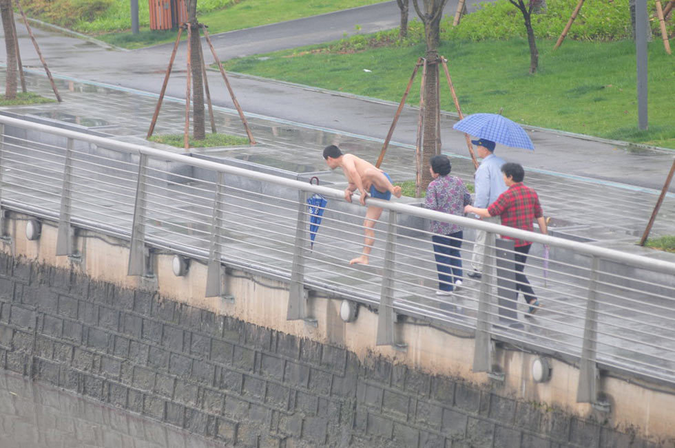 2013年5月9日,浙江宁波,宁波海曙濠河公园,只见李师傅脱去衣服,翻过护栏,跳入江中。