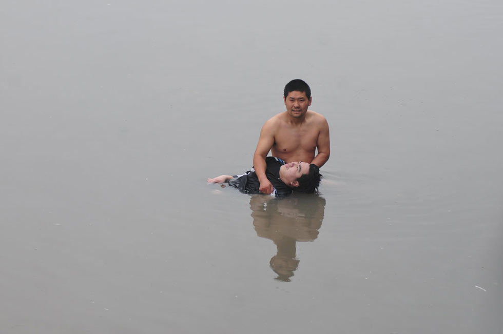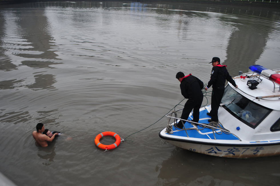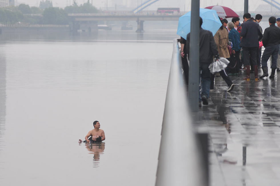2013年5月9日,浙江宁波,“这是我头一次拍到跳江全过程,也是头一次看见救人者二话没说脱成光膀子,再一头钻入江里,一手托头一手划水把人救上岸……”。浙江宁波,宁波海曙濠河公园,邬阿姨在岸边不停喊着‘救救他’,向路人求助。