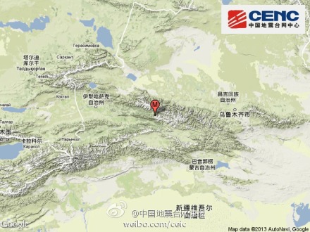 据测定,发震时间在北京时间2013年5月20日5时33分;发震纬度位于北纬43.6°, 东经84.0 ° ;震源深度 9 公里。