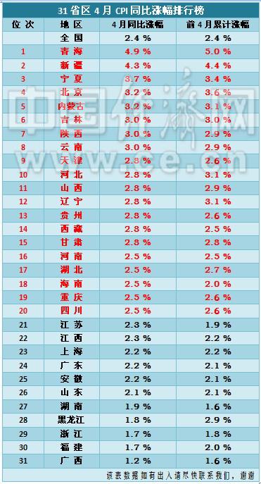31省区4月CPI同比涨幅排行榜。标红的为CPI涨幅超全国水平的省区。制表人 宋雅静