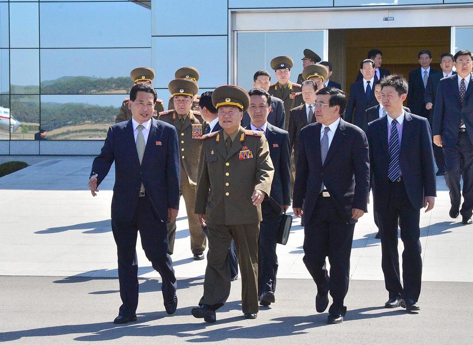 当地时间2013年5月22日,朝鲜平壤,金正恩的特使崔龙海(中)以及其他代表准备前往中国。
