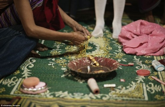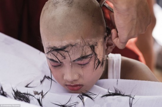 剃度礼当天清晨,母亲正仔细为孩子化妆。