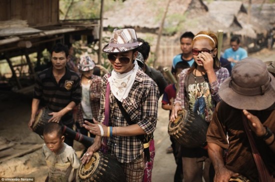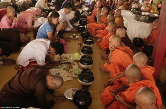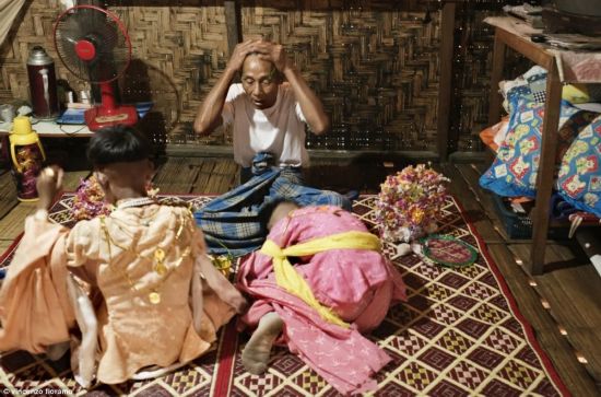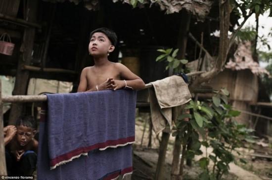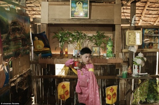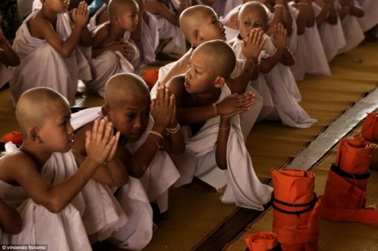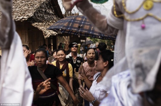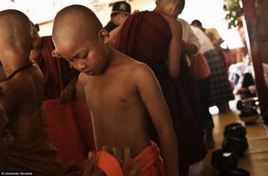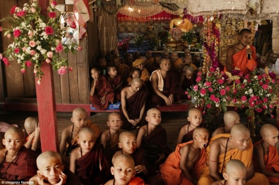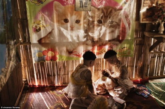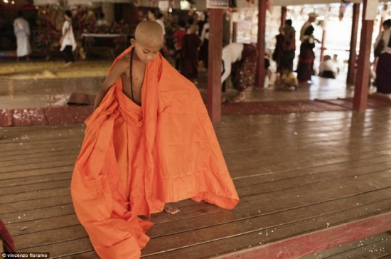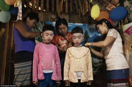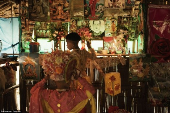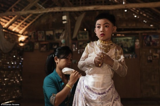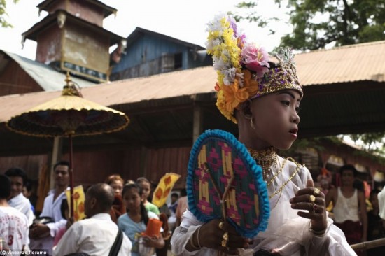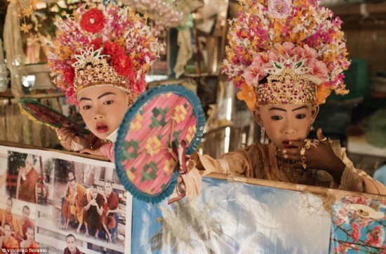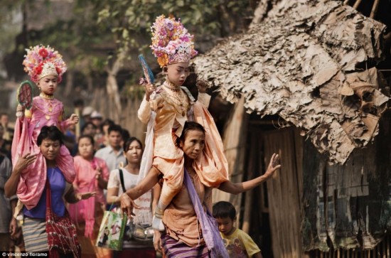 摄影师Vincezo Floramo拍下Ta Pwe庆典的全程画面。庆典第一天,两个孩子骑在长辈肩上在营地内游行。仪式开始后,先上演戏剧,接着孩子们跟随僧侣游行直至修道院,之后接受剃度,换上白色长袍,背诵《十戒律》,最后被授予僧侣长袍。尾声,父母们抛洒硬币、糖果、玉米花作为献祭,给予孩子钵盂及棕榈树叶。