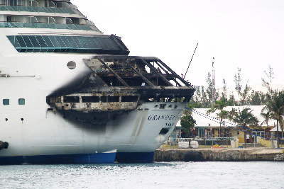 图为“海洋富丽号”游轮27日停靠大巴哈马岛自由港,船尾被烧得面目全非。