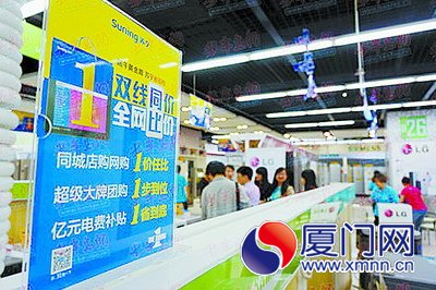 昨天下午,记者走访了莲岳路上一家苏宁门店,店内已经挂起很多有关线上线下同价的宣传语。“苏宁这次推出的线上线下同价,不仅意味着实体店商品无条件与线上苏宁易购的价格相同,同时也将参照国内其他上规模的电商企业的价格。”苏宁云商集团股份有限公司厦门地区管理中心总经理王明祥说。