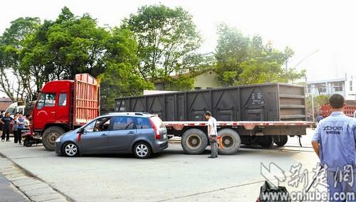 昨日下午4时40分许,武昌烽火村江盛路道口,一节与车头分离的火车车厢,在靠惯性滑行过程中,撞上一辆半挂卡车。卡车遭到冲击后又撞上一辆轿车,所幸无人员伤亡。