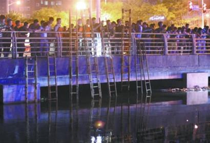 昨晚9时许,在卫工明渠十马路段,消防人员将梯子逐个插入水中扎“篱笆墙”,一旦落水小伙漂至这里,将被拦住。本组图片由辽沈晚报、北国网记者 查金辉 摄