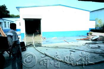 高压水带正在稀释车间中的氨气,刺鼻气味不时随风而至。本报记者 徐延春 摄