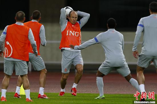 6月9日,荷兰国家足球队在北京奥体中心进行抵京后的首堂训练课,以备战本月11日与中国男足的国际足球友谊赛。图为罗本(中)与队员进行训练。中新社发 富田 摄