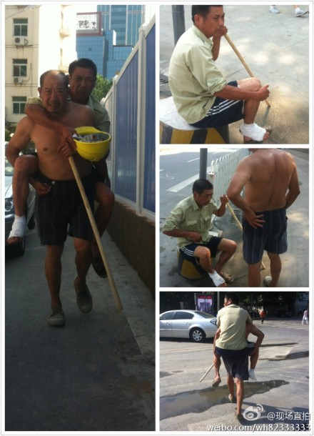 昨天上午8点半,王先生开车行驶在建设大道上时,看到前方地铁围栏旁,一名中年男子背着另一中年男子在车流中穿行,过往车辆纷纷避让,被背的人左手拿着一根拐杖,右手拿着一个工帽,右脚缠着绷带,背他的男子汗流浃背。