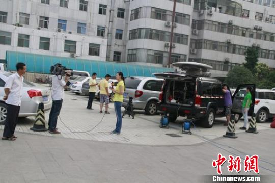 央视卫星直播车停在医院广场准备就绪。陆巍摄