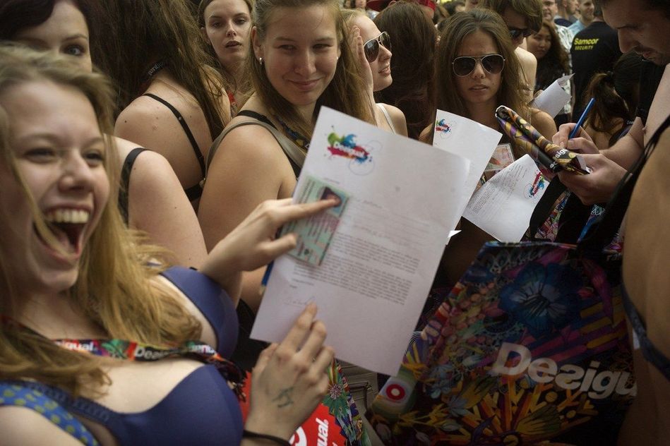 当地时间6月21日,捷克,一家商场举行半裸促销活动,前百名半裸进入商场的顾客可以免费购得两件商品,活动吸引众多顾客参加。