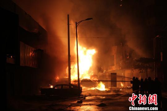 爆炸后,槽罐车车载的液体顺着下水道边流淌边燃烧,整个摩托车市场陷入一片火海。 吴文霞 摄