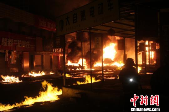 据介绍,接到民众报警后,驻地消防官兵迅速赶赴现场扑救。在市场内,道路两旁都是电动车、摩托车店,液体顺着下水道边流淌边燃烧,此时整个市场陷入一片火海。