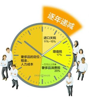 李伟是中国钟表协会收藏研究委员会执行委员,昨天晚上,记者联系到他的时候,他正在和一帮朋友聊“零关税”的事儿。他说,由于还没有看到中瑞自贸协定的细节,一切都还要边走边看,大家的看法是,不会一下子影响到手表的价格。 同样,商务部研究院外贸研究室副主任、研究员张莉上午告诉记者,由于中瑞自贸协定产品目录还没有完全出来,现在不太好判断。但她表示,来自瑞士的产品降价是一个趋势,但是降价幅度不会特别大,因为关税并非影响最终价格的关键因素。目前在售的瑞士表征收的税种包括11%到15%的进口关税、17%的增值税,一万元以上的手表还需征收20%的奢侈品消费税。自贸协议生效后,逐年降低的只是原本税率就相对降低的关税。更何况,奢侈品的定位、租金、人力成本都是影响价格的因素。张莉判断,未来高端产品或有10%左右的降价空间。