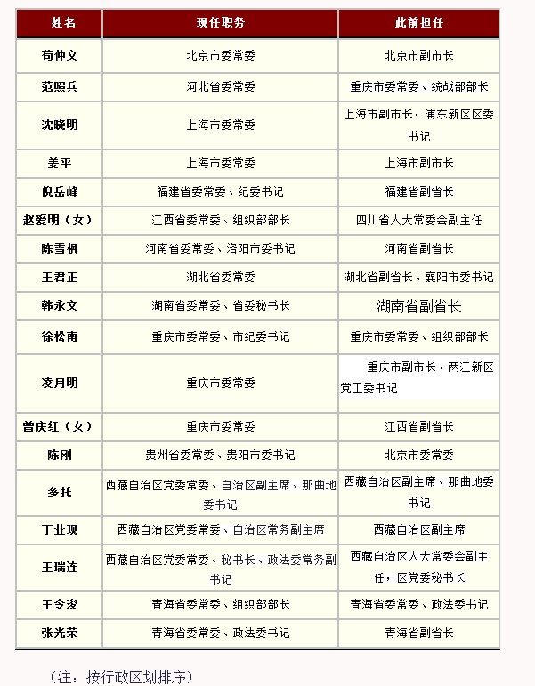 据记者观察,此番调整中,由政府副省长转任常委的人数最多。苟仲文、沈晓明、姜平、韩永文、王君正、张光荣、倪岳峰、陈雪枫、凌月明、曾庆红、多托、丁业现此前均担任省(区、市)政府副职。