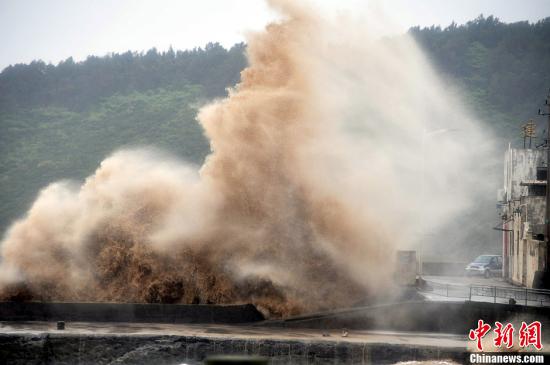 7月13日下午,浙江台州玉环受“苏力”影响,其坎门镇后沙海港海面风力超过10级,强风掀起巨浪如海啸般向港口堤坝扑来。据悉,当天16时,台风“苏力”减弱为强热带风暴,在福建连江黄岐半岛登陆,登陆时中心位于北纬26.3度,东经119.7度,风速33米秒,风力12级,中心气压975百帕。中新社发林冰峰摄