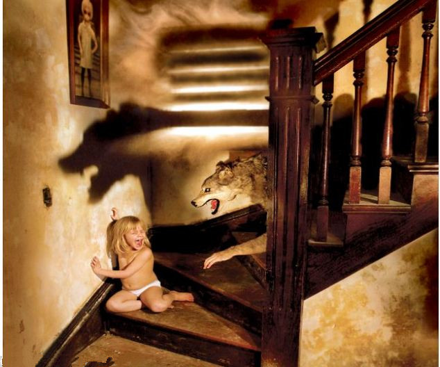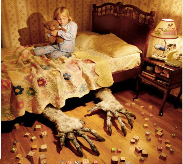 从藏身楼梯下的怪物注视楼上一个小女孩的身影的画面,到一双巨大的手从一个被吓坏了的孩子的床下伸出的画面,摄影师生动地营造出了一种怪异可怕的气氛。约书亚的灵感来自给他的四个女儿读床边故事的经历,其中有两个女儿出现在这个系列摄影中。他告诉读者们,他将女儿设定在特定的有“鬼”出没的情景中,但他保证他的女儿们并没有被这些场景吓到。约书亚说:“她仅仅只愿意表演大约一分钟的时间,我得用烘烤的饼干来哄她。”他还说,最有争议的一张照片拍摄的是一个穿着尿布被狼吓得尖叫的孩子。