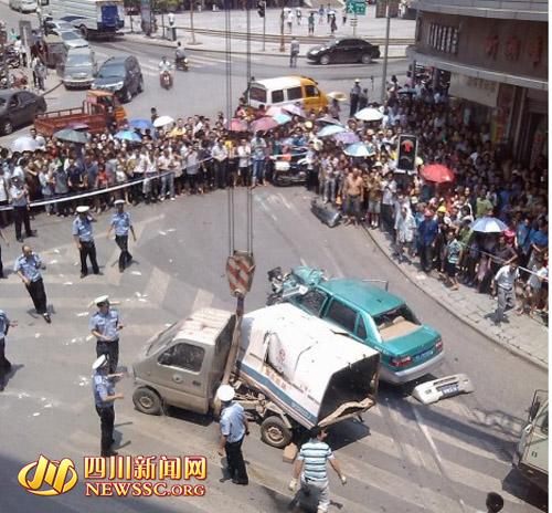 据现场目击者讲述:一辆从通江方向驶往平昌县城满载碎石的农用车在江口镇新华街与一辆轿车相撞后,继续向前行驶,相继与一辆出租车和一辆环卫车相撞,并侧翻钻进街旁的门市内。事发当时正值正午,车祸现场散发着一股浓烈的柴油气味,情况相当危急。随后两辆消防车先后赶赴现场实施救援。