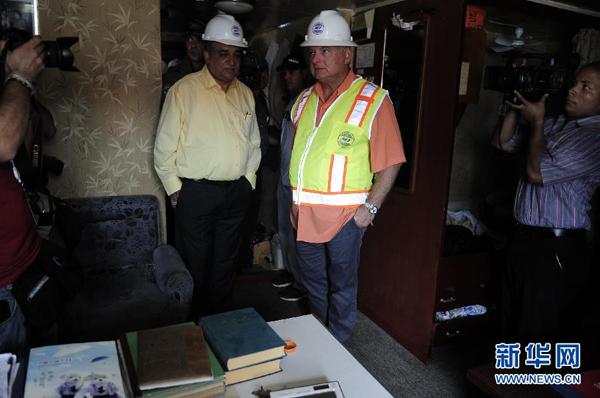 7月16日,巴拿马总统马蒂内利(右)在停靠于巴拿马曼萨尼约港附近的一艘从古巴驶往朝鲜的船只上视察。新华社发(毛里西奥摄)