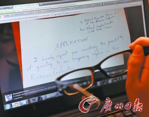 17日,俄罗斯伏尔加格勒,网络上公布的美国“棱镜门”事件揭秘者斯诺登临时避难申请手迹。