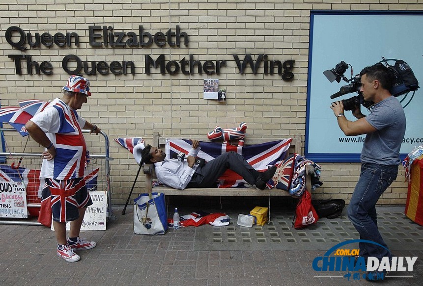 来自英国剑桥郡的皇室迷驻扎在伦敦圣玛丽医院外的长椅上,等待凯特王妃生产。