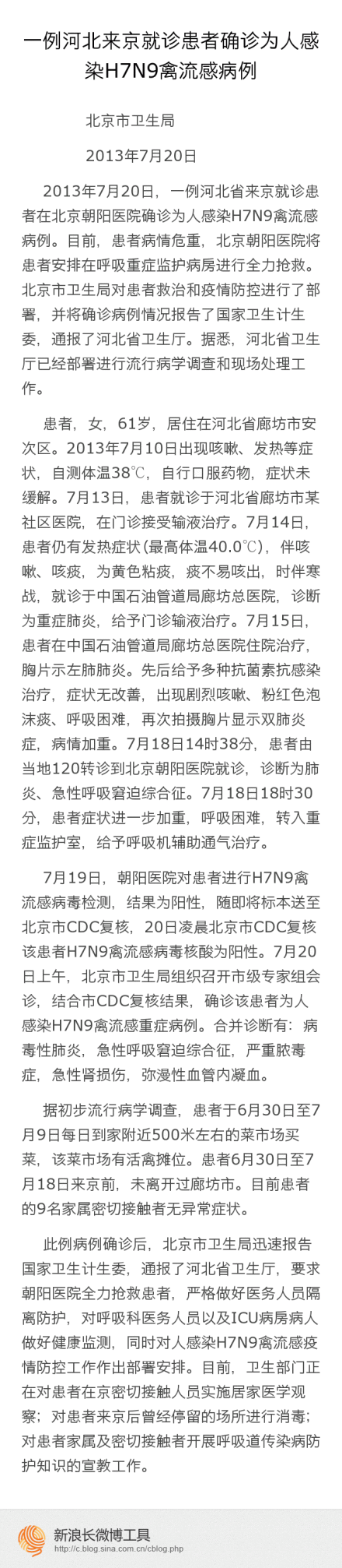 首都健康:【一例河北来京就诊患者确诊为人感染H7N9禽流感病例】2013年7月20日,一例河北省来京就诊患者在北京朝阳医院确诊为人感染H7N9禽流感病例。目前,患者病情危重,北京朝阳医院将患者安排在呼吸重症监护病房进行全力抢救。