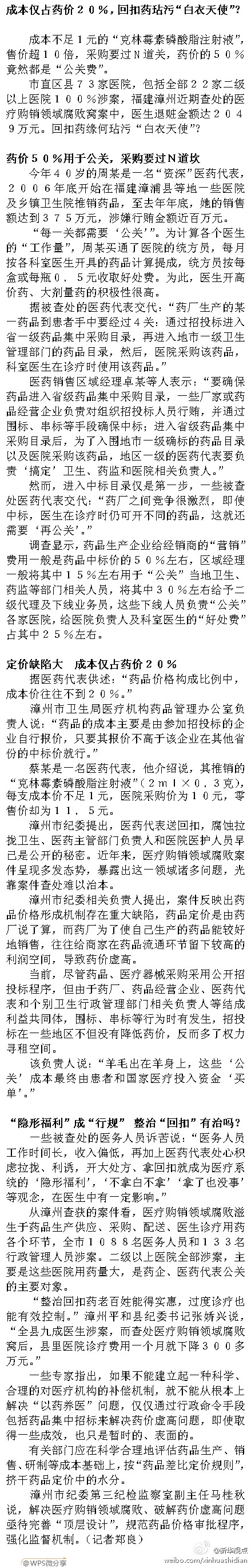 时刻新闻 —分享— 【成本仅占药价20%,回扣药玷污“白衣天使”?】福建漳州近期查处的医疗购销领域腐败窝案中,市直区县73家医院100%涉案,医生退赃金额达2049万元。采购要过N道关,药价的50%竟然都是“公关费”! 来源:新华网 编辑:蔡娟