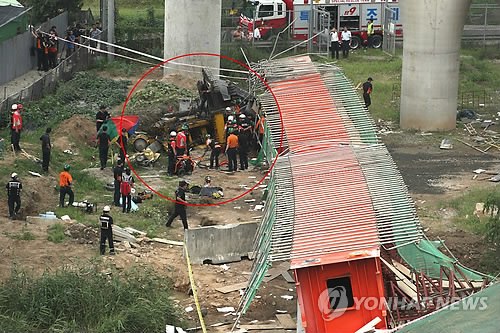 韩国首尔市汉江傍花大桥匝道施工现场30日发生重型建筑装备倒塌事故。(韩联社)