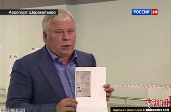 据美联社报道,美国“棱镜门”项目泄密者爱德华·斯诺登的律师于8月1日表示,斯诺登目前已经离开了莫斯科机场,此前他刚刚获得了有限期为一年的俄罗斯临时难民身份。斯诺登6月23日由香港飞抵莫斯科,随后便滞留在谢列梅捷沃机场中转区。此间美方持续向俄方施压,要求交出受到间谍罪指控的斯诺登,但遭俄方多次拒绝。图为俄罗斯Russia24电视频道的截图,俄罗斯律师库切列纳当日在莫斯科舍列梅季沃机场与美国中情局前雇员斯诺登会面后,向媒体展示了一份允许斯诺登进入俄罗斯境内临时文件的照片。
