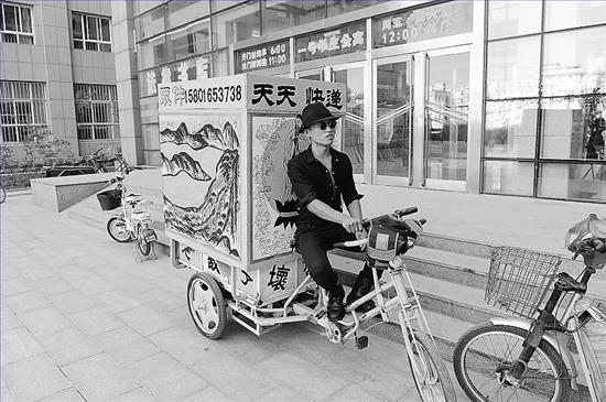 脚蹬黑色马丁皮靴、身穿黑色潮服、头戴黑色礼帽,骑着拉风的手绘电动三轮车,近日,邢台籍快递哥臧敬川成了中国政法大学校园里一道别样的风景。别出心裁的装备使得22岁的臧敬川迅速走红校园和网络,有人称他为“最酷快递哥”,还有人说他是“快递版的迈克尔·杰克逊”。