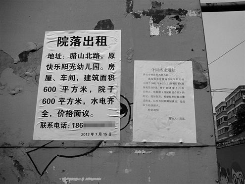 房东在幼儿园外墙张贴出租告示和“合同终止通知”