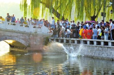 昨天下午,现场仍有多人讨论此事。附近餐厅老板称,当时两名钓鱼的中年男子先后在推搡中跌入水中,一人游过桥从水较浅的桥西北侧自行上岸,一人则被护栏附近的人拉上岸,两入水者均无大碍。“还有两个人因钓鱼位置吵起来了,不过因有不少人劝架而很快平息”,李老板说,约半个小时后,钓鱼者和围观人群基本离开,“火神庙常举行这种放生仪式,每次都有人来钓放生鱼,虽然没有犯法,但是感觉很别扭,没道德”。