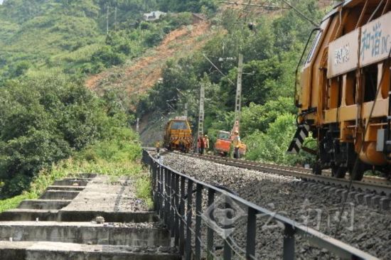 由于事故现场靠近滑坡地段遭到封闭,记者无法前往采访,只能在离现场较远的地方进行拍照。记者在离现场40余米处看见,除被冲毁的铁路上有机械和少数人员作业外,冲毁的公路现场并无抢险人员。 (记者 徐弘毅)