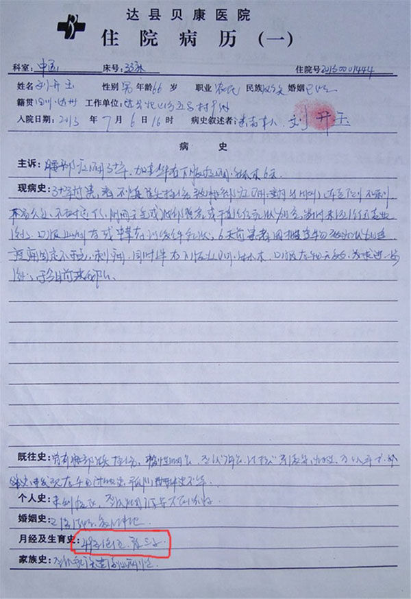“我爸爸明明是个六十几岁的老汉,病历上却说他49岁绝经,那不成女人了?”刘祥义提供的病历中,患者入院初诊的“月经及生育史”一栏,清晰地写着“49岁绝经.育三子”。
