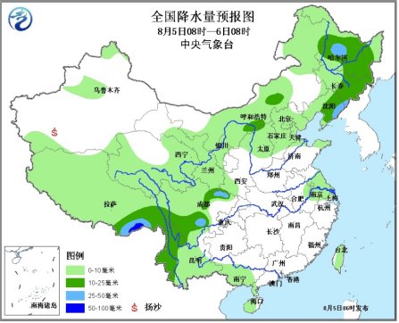 5日08时至6日08时,内蒙古东部和中部、东北、华北大部、西北地区中东部、四川、云南、青藏高原、广西西南部、海南、台湾、新疆天山地区等地将有小到中雨或雷阵雨,其中黑龙江中部、辽宁东部、四川盆地北部和南部的部分地区有大雨或暴雨,上述地区并伴有短时雷雨大风等强对流天气。