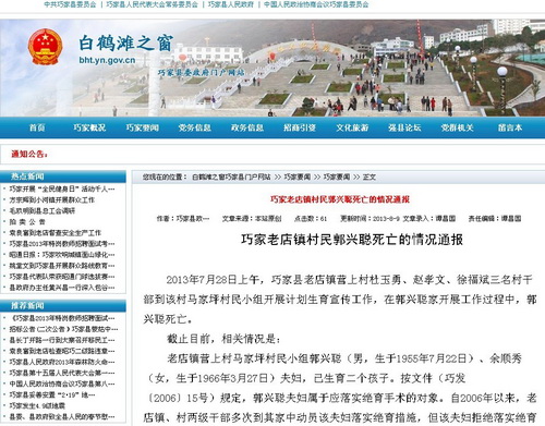 人民网北京8月9日电(记者耿聪)近日,网络上出现一则实名投诉云南省昭通市“巧家县59岁村民死在强行结扎路上”的帖文引发社会关注。9日晚云南省巧家县政府网站通报,经警方检验,该县村民郭兴聪系敌敌畏中毒死亡。