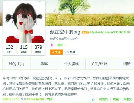 “头等舱乘客因为没有专车载往登机,5人拦、抱飞机轮胎!”昨日,有多名网友在微博爆料,称8月8日晚在重庆江北机场遭遇抱住飞机轮子的头等舱乘客,致航班延误。