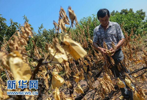 (8月7日,奉化市水蜜桃种植大户杨金宝查看因近期持续高温晴热而枯死的一株桃树。当日“立秋”,也是浙江省有气象记录以来高温强度最“彪悍”的一天。据浙江省气象台监测,至16时,全省有45个县(市、区)最高气温达40℃以上,27个县(市、区)达41℃以上,5个县、市超过42℃。其中奉化市最高气温达43.5℃,刷新了保持10年之久的全省最高气温纪录(原纪录为2003年丽水的43.2℃)。新华社记者 韩传号 摄)
