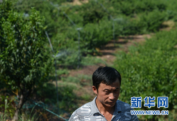 ( 8月7日,奉化市水蜜桃种植大户杨金宝走过一片正在喷灌补水的水蜜桃树林。新华社记者 韩传号 摄)