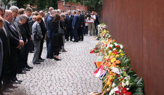 国际在线专稿:据德国之声8月13日报道,当地时间8月13日,德国柏林举行了多个以柏林墙为主题的纪念活动,纪念活动的中心是具有历史意义的柏林贝瑙尔大街。柏林市长沃维莱特(Wowereit)和德国文化部部长诺伊曼(Neumann)在此为东德时期的牺牲者敬献了花圈。