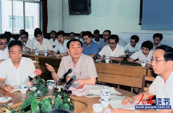 1989年7月22日,朱镕基在中共上海市委党校与干部轮训班学员座谈。前排右一为市委常委、市委组织部部长赵启正,左一为市委党校副校长严家栋。 (郭天中摄)