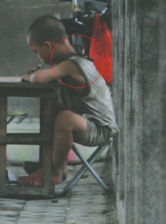 昨天下午4点半左右,成都商报记者来到报料人所说的地点。这里紧靠着菜市场,在一间平房外面,一名小男孩背对着河,铁链环绕一圈拴在脖子上,另一端拴在河岸的栏杆上。小男孩正趴在木板搭的桌子上写字。小孩很平静,与旁边的中年男子正常交流着。不过待记者走近后,才发现男孩脖子上的铁链已经被取走。