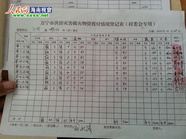 记者在翁先生提供的一份制表日期为2010年10月25日的《万宁市洪涝灾害救灾物资拨付情况登记表(村委会专用)》上看到,当天坡仔村委会拨付给下属九个小组的救灾物资共有大米5000斤,蔬菜1400斤,猪肉740斤,鱼700斤等。