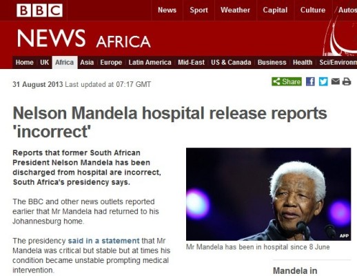 英国广播公司随后不久发表声明称,关于曼德拉出院的报道“有误”。声明还称,作为南非“国父”,曼德拉的病情受到了各国关注,世界各地的人们都以送上他们最好的祝福,祝愿这位老者早日康复。