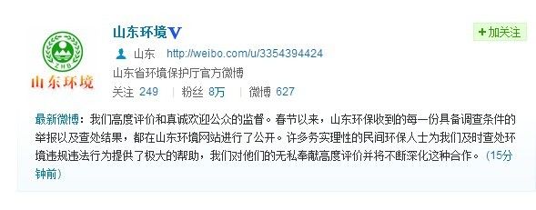 “山东环境”还表示,“我们高度评价和真诚欢迎公众的监督。春节以来,山东环保收到的每一份具备调查条件的举报以及查处结果,都在山东环境网站进行了公开。许多务实理性的民间环保人士为我们及时查处环境违规违法行为提供了极大的帮助,我们对他们的无私奉献高度评价并将不断深化这种合作。”