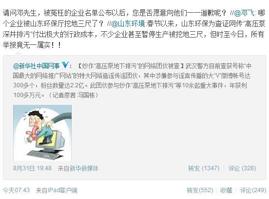 之前一天,“新华社中国网事微博”刚刚发表《炒作“高压泵地下排污”的网络团伙被查》的微博,称武汉警方目前查获号称“中国最大的网络推广网站”的特大网络造谣传谣团伙,其中涉嫌参与谣言传播的大“V”微博帐号达300多个,粉丝数量达2.2亿。此团伙参与炒作“高压泵地下排污”等10余起重大事件,年获利100多万元。