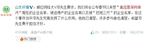 微博发布后,山东省环境保护厅官方微博“山东环境”在今日进行转发,并称“春节以来,山东环保为查证网传“高压泵深井排污”付出极大的行政成本,不少企业甚至暂停生产被挖地三尺,但时至今日,所有举报竟无一属实!!”