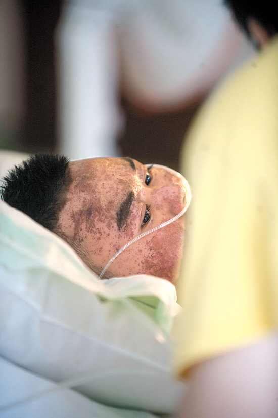 阿飞瘫在病床上,身体多处烧伤
