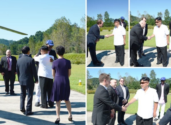 (近日,朝鲜最高领导人金正恩已在平壤再次会见并宴请了正在朝鲜访问的前美国全国篮球协会(NBA)球星罗德曼。其中一张朝鲜官方公布的照片上却见到罗德曼居然有“第三只手”。外界相信这只“怪手”来自罗德曼与金正恩之间的翻译,是朝鲜当局PS照片时一时忽略而弄出的笑话。)